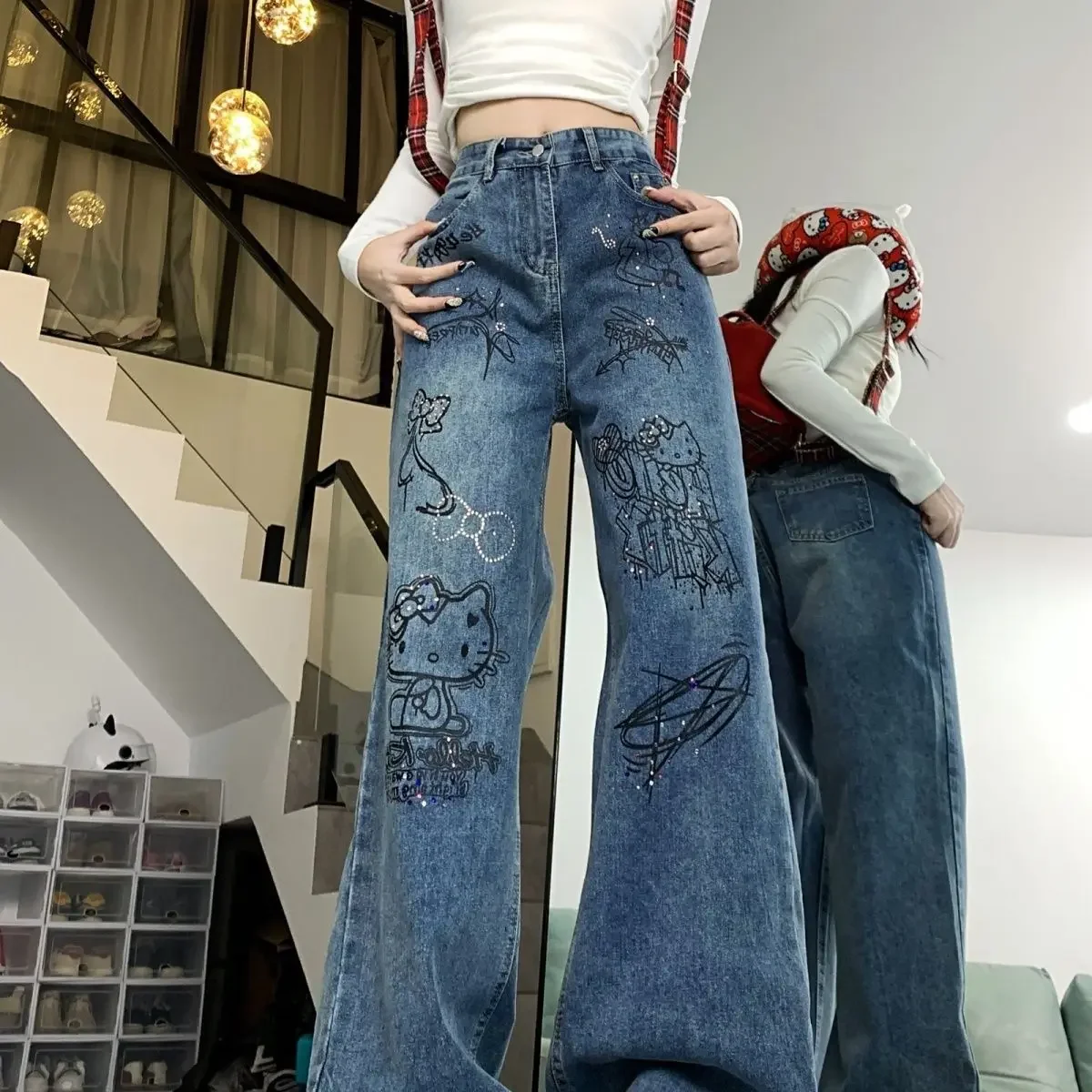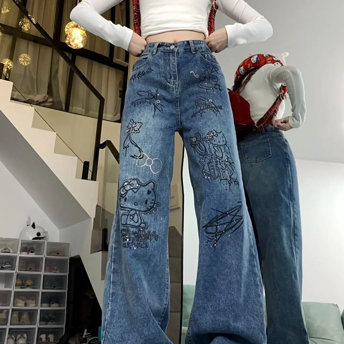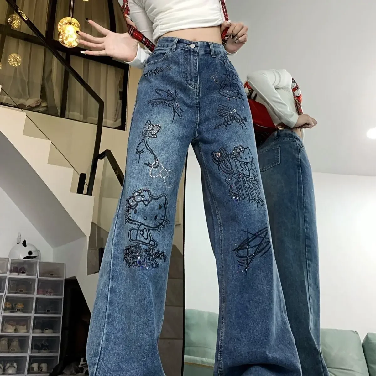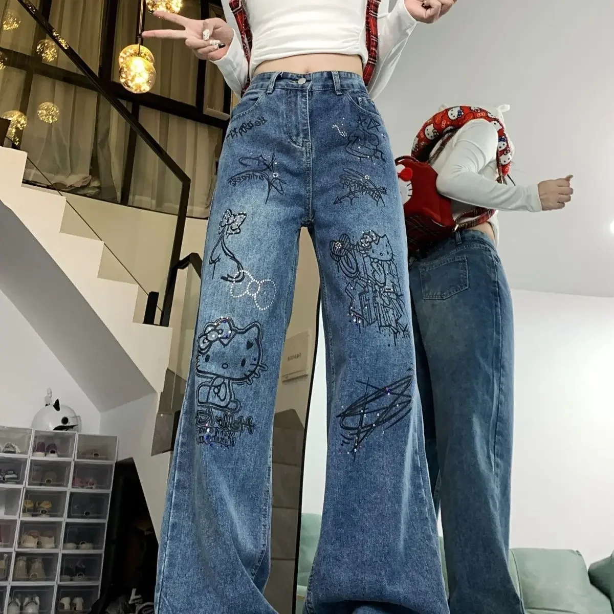 Pantalones vaqueros ajustados con diseño de grafiti azul lavado para mujer, pantalones informales con efecto adelgazante, a la moda