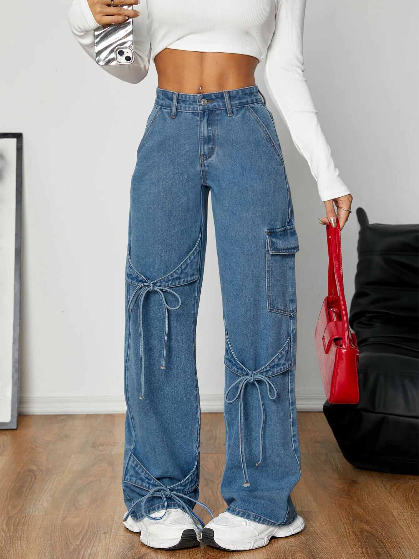 Pantalones vaqueros de mezclilla para mujer, pantalones de pierna ancha rectos, ropa de calle 2025, pantalones desgastados lavados con lazo