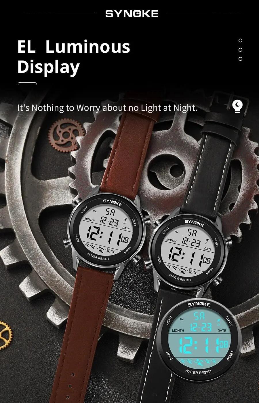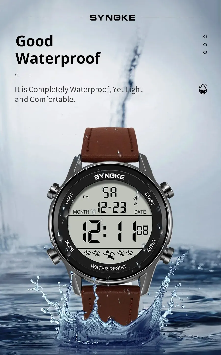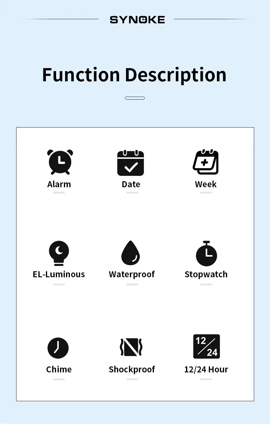 • Resistencia al agua de 5Bar :Este reloj digital para hombres de Synoke ofrece una resistencia al agua de 5Bar, permitiéndole disfrutar de actividades al aire libre sin preocuparse por daños por agua.